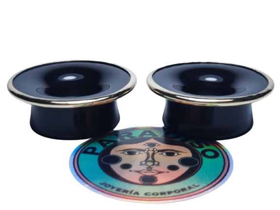Black delrin ear muffs with custom forged and welded gold bezel mechanically assembled to the disc, without glue, manufactured in our workshop here in Guadalajara, Jalisco, Mexico. To command to do.