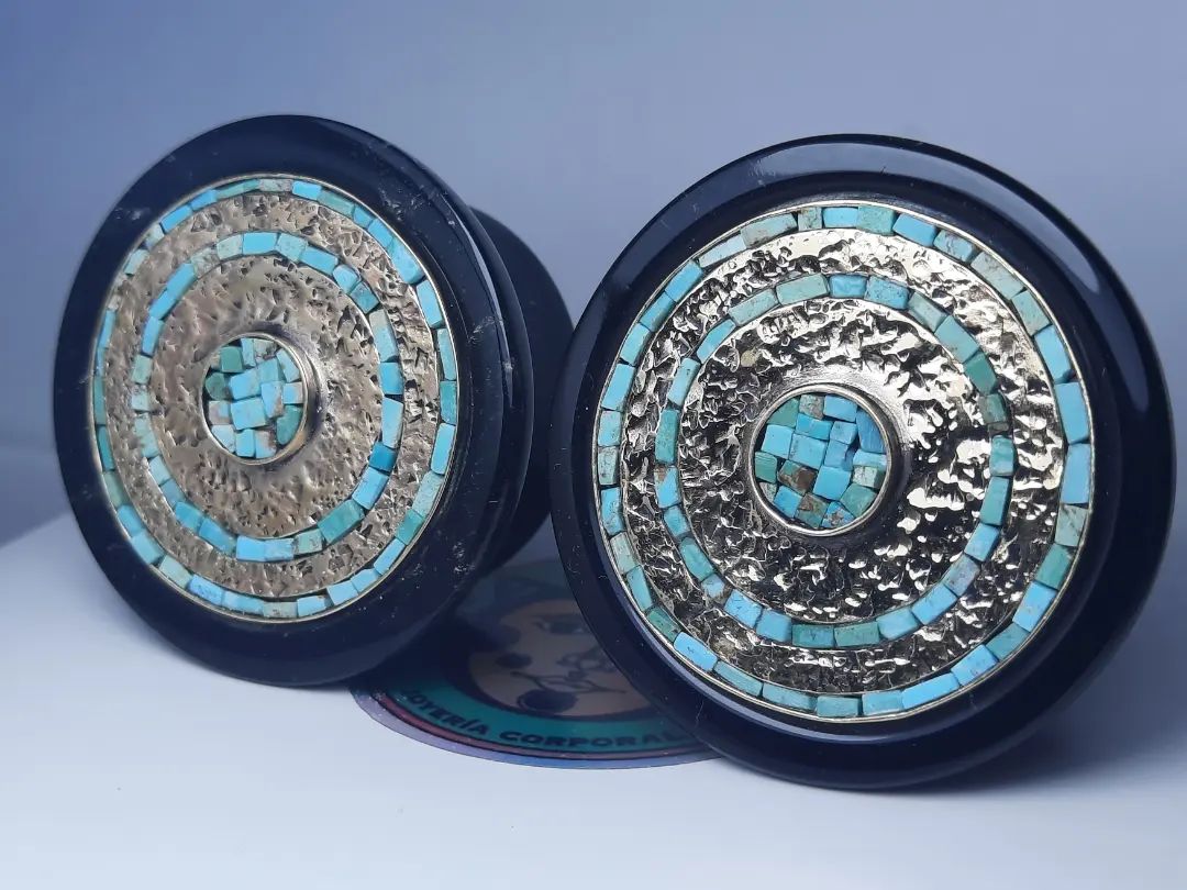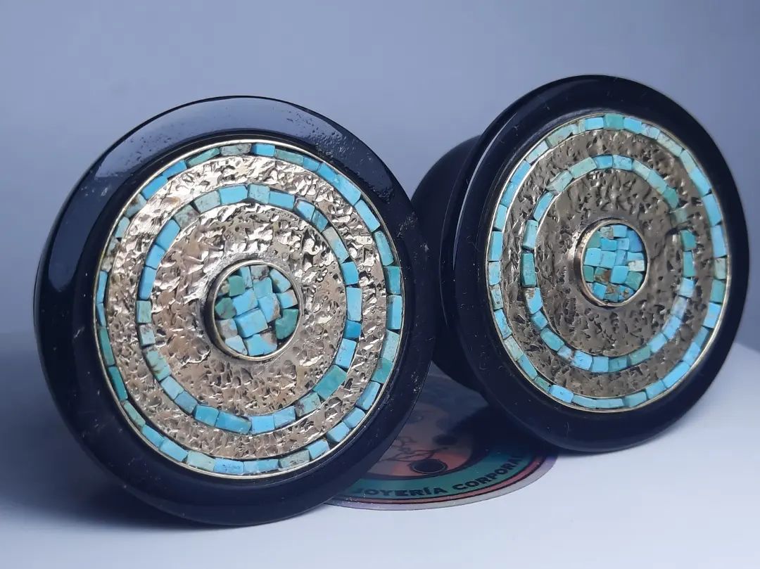 Black obsidian base, textured tumbaga disc (gold and copper) and turquoises inlaid with mosaic resin. Each turquoise block is painstakingly calibrated for assembly on tumbaga hardware.