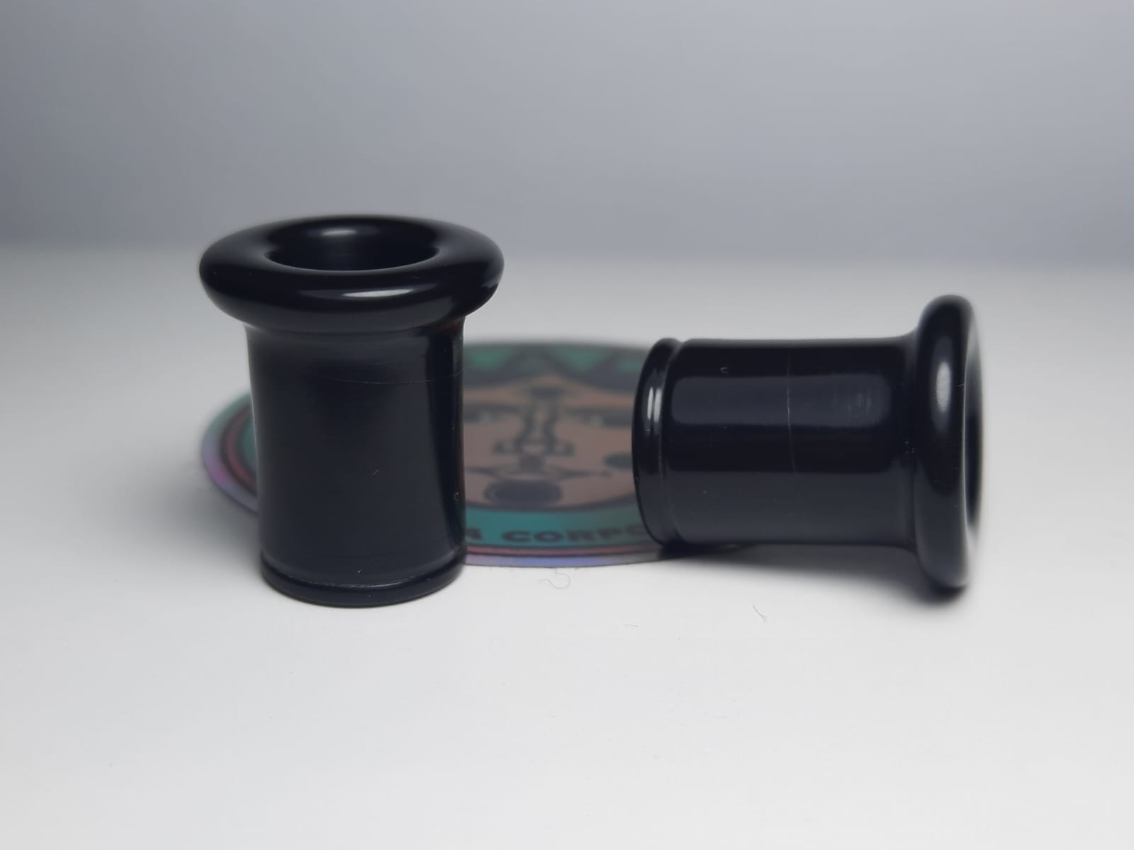 Single flare black Delrin tunnels manufactured in our workshop here in Guadalajara, Jalisco, Mexico. Made to order.