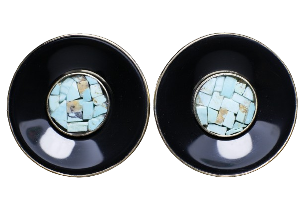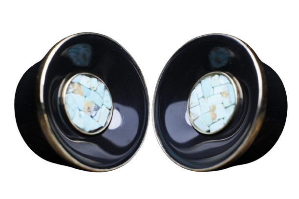 Orejeras de delrin negro con bisel dorado forjado y soldado a la medida ensamblado mecánicamente al disco, sin pegamentos, con mosaico de turquesa honrando a las culturas del antiguo mesoamericano fabricados en nuestro taller aquí en Guadalajara, Jalisco, México. Para mandar a fabricar
