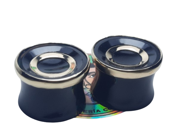Plugs de obsidiana negra con bisel y liga dorada forjado y soldado a la medida ensamblado mecánicamente al disco, la liga está unida con resina polimérica, fabricados en nuestro taller aquí en Guadalajara, Jalisco, México. Para mandar a fabricar.